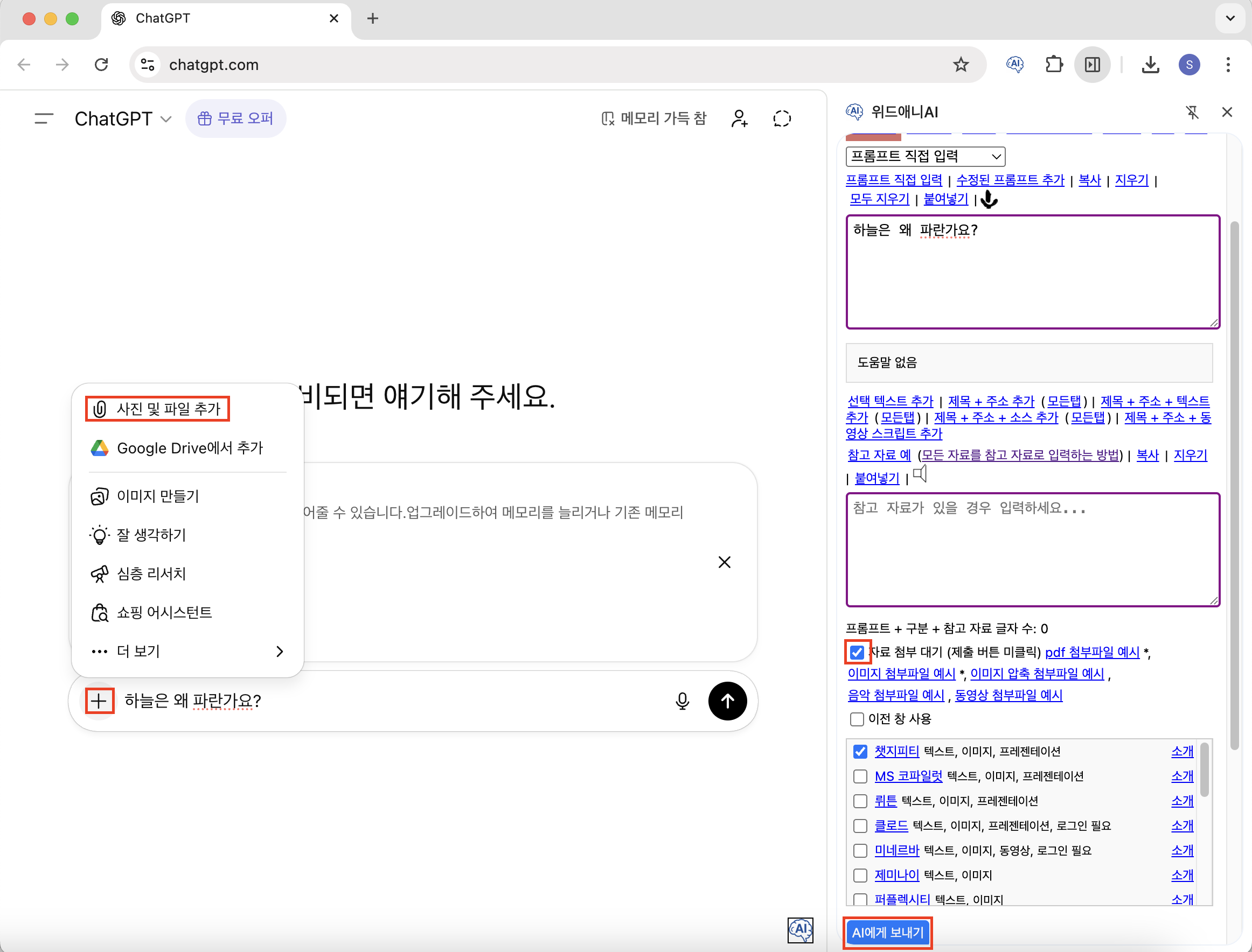 자료 첨부 대기 (제출 버튼 미클릭) 체크 박스 체크후 해당 AI 사이트가 뜨면 거기서 전체 혹은 스크롤 화면 캡처 이미지 파일을 첨부할 수 있습니다.