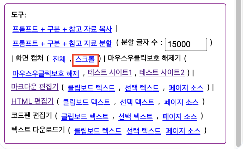 도구의 화면 캡처기의 전체 혹은 스크롤 버튼을 눌러 화면 캡처후